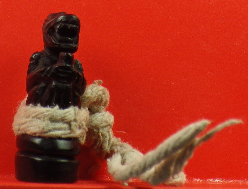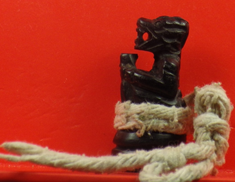 ลิงจับหลัก ไม้แกะเก่า จารเต็มตัว มัดสายสิญจ์ ไม่มราบที่