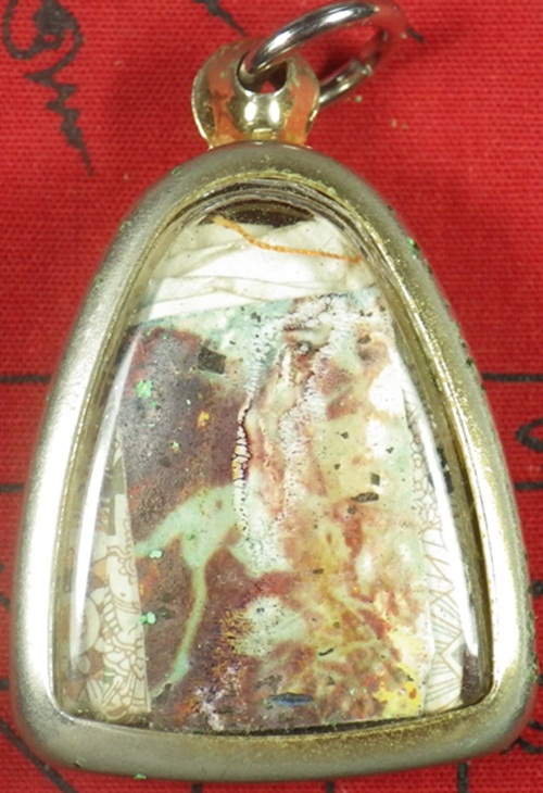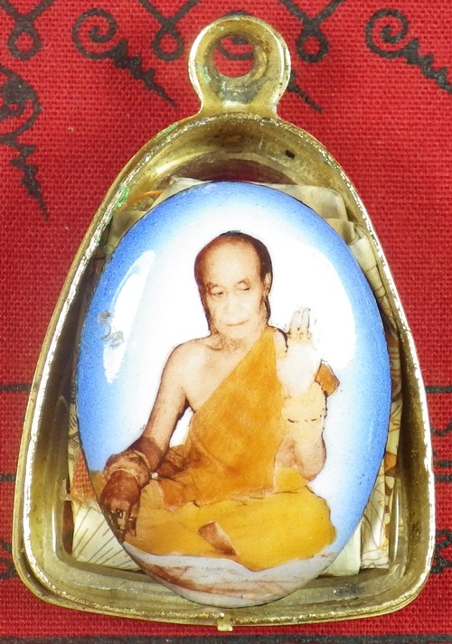 ล็อกเก็ต เครื่องรางเก่า ไม่ทราบที่ มีจีวร ธนบัตรขวัญถุงห่อเกศา จุกยาฉุน และพร้อมทั้งภาพเก่าด้านหลัง |