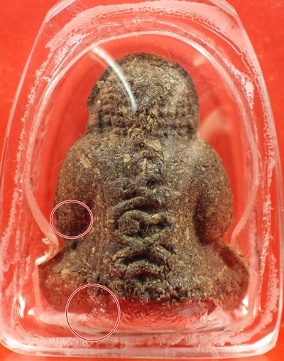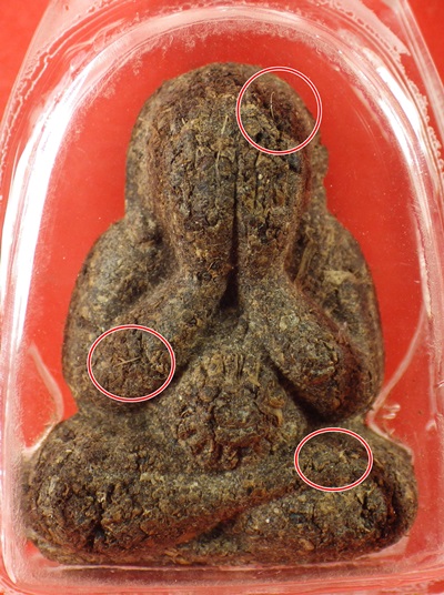 ปิดตารวยทันใจ ปี 2543 ลป.หมุน เนื้อชานหมากผสมผงพุทธคุณ เกศา ว่าน มีเกศาหลวงปู่หมุนเยอะมาก วงกลมแดงคือจุดที่มีเกศาเห็นชัดที่สุด |