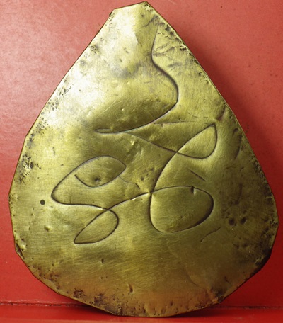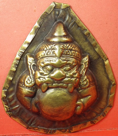 ราหูโบราณ เนื้อทองฝาบาตร อุดผง จารอักขระขอมด้านหลัง สวยมาก กว้าง 2 นิ้ว สูง 2.25 นิ้ว |