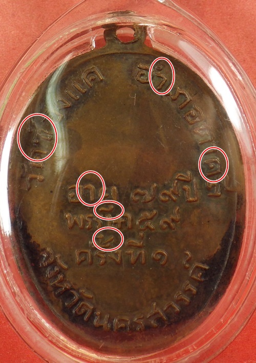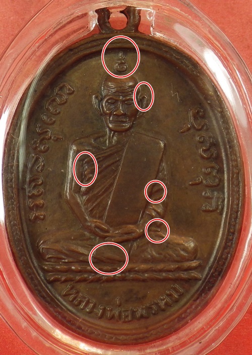 ลพ.พรหม วัดช่องแค เหรียญรุ่นแรก ปี 2507 ตำหนิ...ด้านหน้า 1.เส้นแตกที่ยันต์บนศีรษะหลวงพ่อ 2.หูบนขวามมือเรา ปลายหูจะไม่ติดศีรษะ 3.มีเส้นหนาใต้แขวนซ้ายหลวงพ่อ 4.ชายจีวรข้างสังฆาฏิปลายแยกเป็น 2 แฉก 5.เส้นจีวรตรงปลายแตกคล้ายก้ามปู ด้านหลัง.. 1.ตัว ช หัวจะยาวคล้าน ซ 2.ตัว า มีขีดเกินปลายแหลม 3.หัวตัว ค เป็นตุ่มกลม 4.สระ ุ จะนอนไม่ตั้งตรง 5.ไม้โท จะขาดตรงกลาง 6.ตัว า ปลายจะหาและแบน |