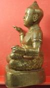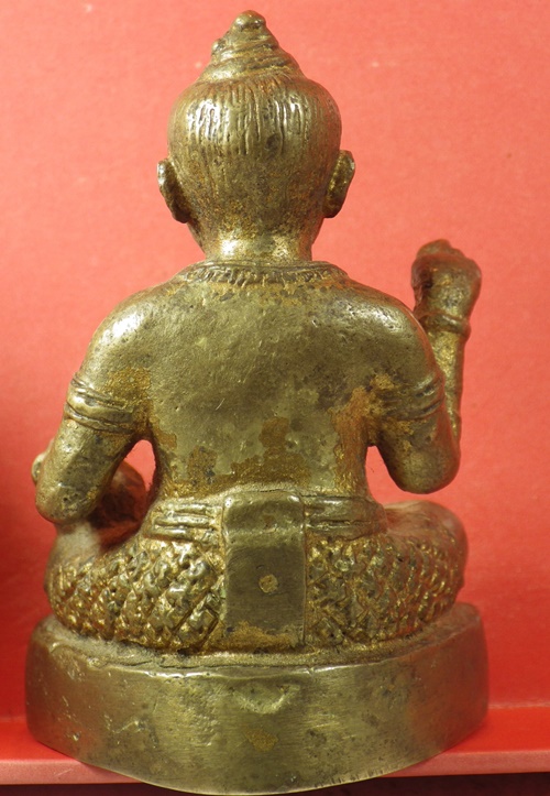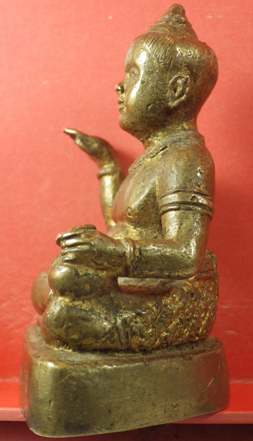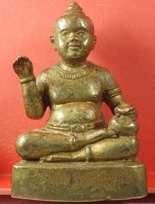 กุมารทองอุดผงพรายกุมาร รุ่น 1 หลวงพ่อดำ วัดสันติธรรม จ. สระแก้ว หลวงพ่อดำ วัดสันติธรรม ชื่อนี้ศิษย์ทั้งหลายในประเทศและต่างประเทศ หรื่อที่หาดใหญ่เองก็ดี ยังกล่าวถึงความขลัง ความศักดิ์สิทธิ์ ของวัตถุมงคลแต่ละรุ่น วัตถุมงคลที่ได้จัดสร้างออกมาแต่ละครั้งนั้น ไม่เพียงพอต่อความต้องการของศิษย์ โดยเฉพาะ แม่นางกวัก , กุมารทอง , ตะกรุดและเครื่อง รางต่าง ๆ เป็นที่เสาะ แสวงหาเป็นจำนวนมาก หลังจากท่านได้หยุดสร้างวัตถุมงคลนานแล้ว เพื่อเดินธุดงค์กลับเขมร บ้านเกิด ในการเข้าไปปฏิบัติธรรมบนเทือกเขากุเลน ที่ห่างไกลความเจริญ เพื่อศึกษาวิชาอาคมเพิ่มเติมจากครูบาอาจารย์ และพระฤๅษีต่าง ๆ อีกหลายรูป ความเป็นมาที่เลื่องลือ แม่นางกวัก กุมารทอง และวัตถุมงคลต่าง ๆ ของหลวงพ่อดำนี้ นอกเหนือจากด้วยความที่ท่านเป็นผู้รู้จริงในวิชาตามตำรับเขมรโบราณพันปี ที่สืบทองเป็นลำดับอย่างต่อเนื่องมาเป็นมาเวลานับพันปี สามารดถนำมาทำให้ ได้ผลดีจริง และ จิตเจตนาอันบริสุทธิ์ ของ หลวงพ่อดำ จะช่วยเหลือประชาชนในยามทุกข์ยากแล้ว ยังเป็นเพราะหลวงพ่อดำท่านนำเอาสุดยอดผงวิเศษที่สำเร็จได้ด้วยยาก ลึกซึ้งสุดพิสดาร มาบรรจุไว้ในวัตถุมงคลทุกองค์ของท่าน นั่นคือ ผงมหาภูติลิ้นทอง และ อาราธนาคุณพระรัตนตรัยลงไปครอบคลุมไว้ให้บังเกิดผลแห่งความดีมีสิริมงคล ลงพระคาถา หัวใจต่าง ๆ ได้แก่ หัวใจพระยาไก่เถื่อน พระยานกการเวก หัวใจสาลิกาลิ้นทอง ฯลฯ ผงมหาภูติลิ้นทองนี้จึงให้ผลาที่เป็นคุณแต่เพียงผ่ายเดียว ครอบคลุมทางด้านเมตตา มหานิยม ค้าขาย การเจรจา โชคลาภ และการปกป้องคุ้มครองจากภยันตรายต่าง ให้เป็นที่ประจักษ์ได้เป็นอย่างดีแก่ผู้บูชาทุกท่านว่าดี เร็ว และแรงจริง ๆ อธิษฐานขอได้ครบ สมใจนึก และช่วยนำพาตัวเองให้อยู่รอดได้ ท่ามกลางสภาวะเศรษฐกิจปัจจุบัน กุมารทองของหลวงพ่อดำ ขนาดบูชาทุกรุ่น เป็นอีกพิมพ์หนึ่งซึ่งได้หมดไปจากวัดนานแล้ว เป็นที่เสาะหาและต้องการของศิษย์มาก ใต้ฐานบรรจุแผ่นยันต์โภคทรัพย์ ขนาดบูชา 2.5 นิ้ว เนื้อโลหะ สร้างน้อย หายาก |